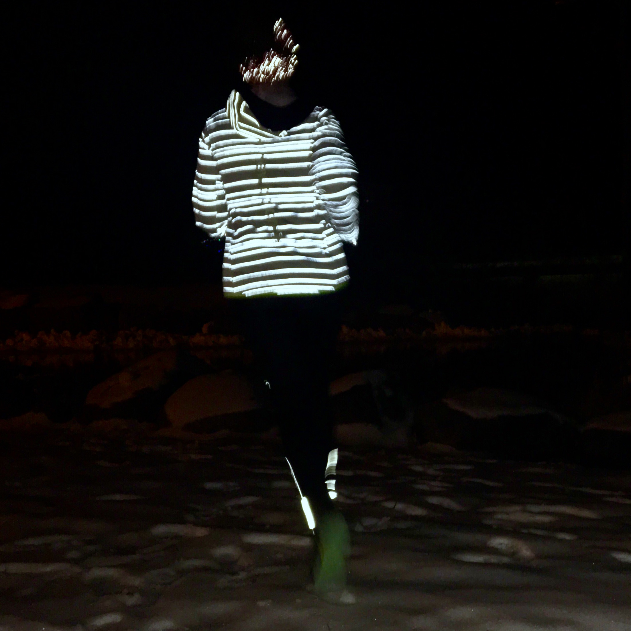 When running in the dark you want to go for the lightest colors possible. I know, I know we all love dark clothes because they are slimming, don’t stain and make you look faster but guess what it doesn’t matter it’s dark after all! Light colors are the most visible to drivers and you’ll be spotted soonest if you’re wearing them. They also reflect available light so much better. If there is one thing to invest in it’s a very light or ideally white running jacket or outer layer topper since it’s at driver’s eye level. The one that I have is next level amazing because not only is it white with neon accents, it has reflective stripes right in the material and if you leave it out in the light before it even glows in the dark. I included a flash picture of me wearing it to give you an idea of what drivers see when I’m wearing it. Invest in the best one you can find and if you end up finding an even better one after, pick that up too!