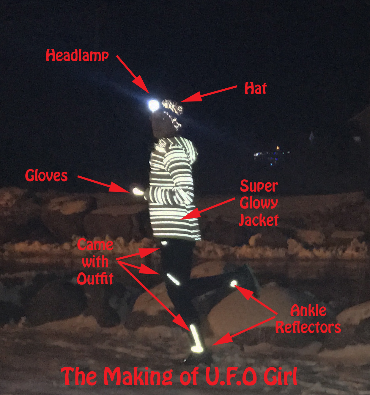 My nickname around here, alright one of many, is UFO girl due to the way I glow when running at night. Actually, the way I dress up to run at night has more than a few stories. My personal philosophy is that you’ll never regret putting on the item or light that prevents you from getting hit. But if that works you’ll never know which one it is so best bet is to just wear them all. When honey’s kids were teenagers out with their friends they denied that they knew it was me when their friends asked, “Isn’t that Allison?” Our volunteer Fire chief who’s obviously really into safety also confessed to thinking “What idiot is that all lit up? OOOhhhh that’s Richard’s idiot!” You might think this embarrassed me but it did the opposite making me proud to know that I’m really, really visible. So if you want to be your own village’s lit up idiot just follow all of these tips!