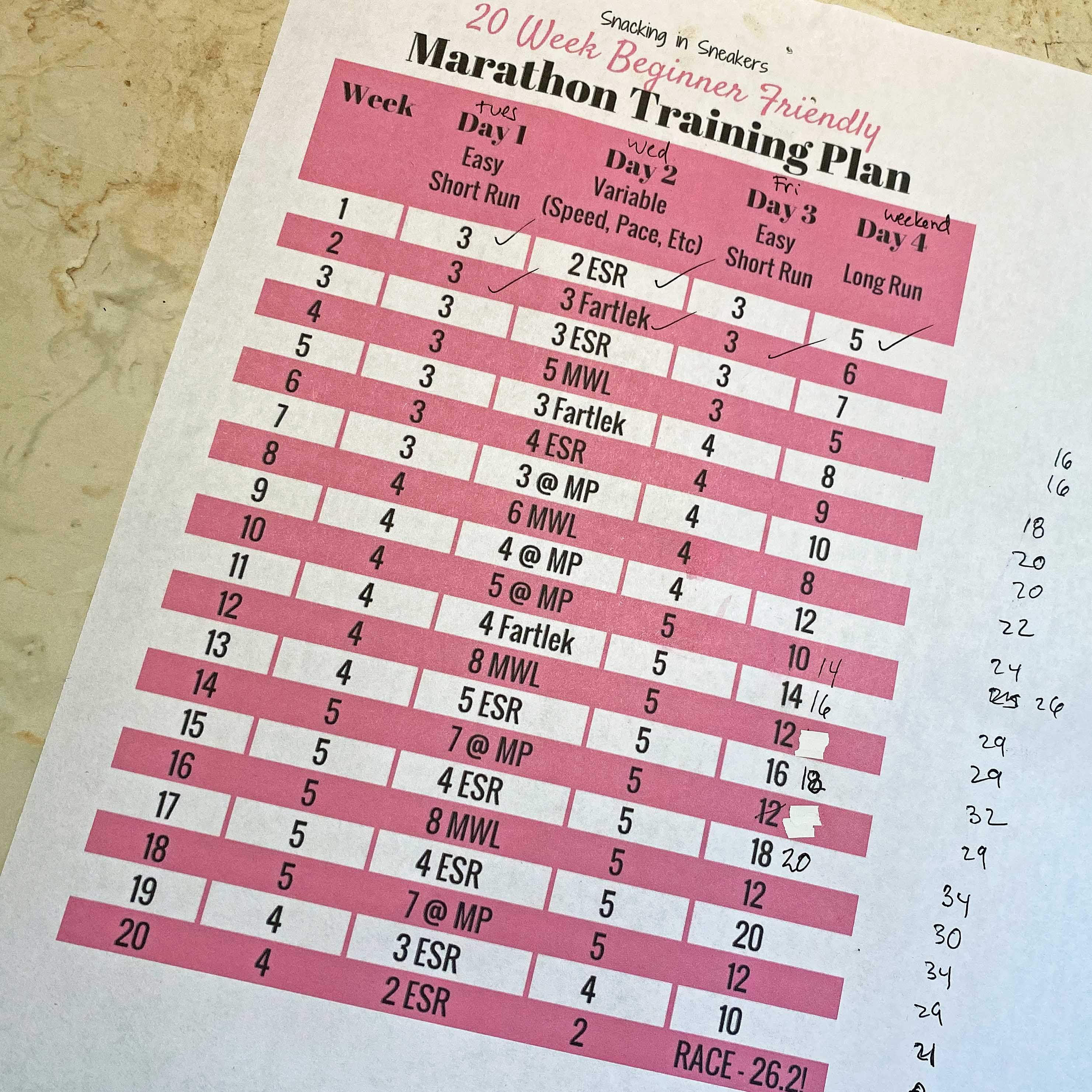 Like many first time marathoners I’m a little obsessed with that 10k race day training gap. The plan I picked is available here *thank you! But I plan on tweaking it just a little. I’d like to do one extra 20 mile run so I’ll play just a bit with some of my long runs to get the 18 miler before up to 20. Other than that I’ll be sticking to it except I’ll be converting all those miles to km!