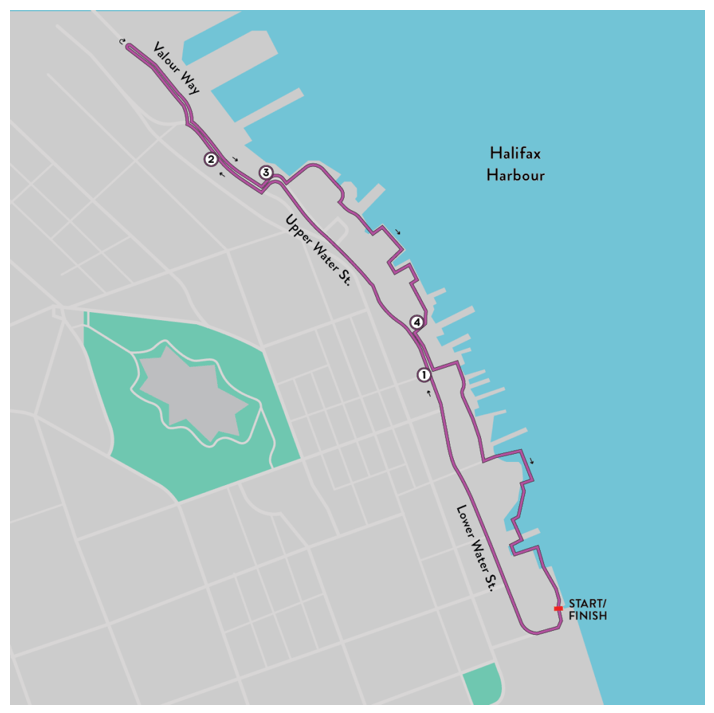 Course: This race took place along the Halifax waterfront. While it was flat there were so, so many 90 degree turns! Usually I use my own data for the route map but I’ve done something weird so much of my data is missing. Instead enjoy a route map from the website. The out portion of the race takes you along Upper Water St. past the Casino and over to the DND base and the back takes you along the waterfront. I did the second heat so there was minimal pedestrian traffic on the course. I imagine the first heat would be the clearest while the third might actually have quite a few other walkers along the way. There is a bike lane all along the way for ‘passing’ but obviously use this with great care. The majority of the second half of the race is along the waterfront boardwalks which has 24! 90 degree turns! If the idea of that many tight corners makes your joints hurt then maybe this is not the race for you. If that’s fine in your books then the course really is quite beautiful.