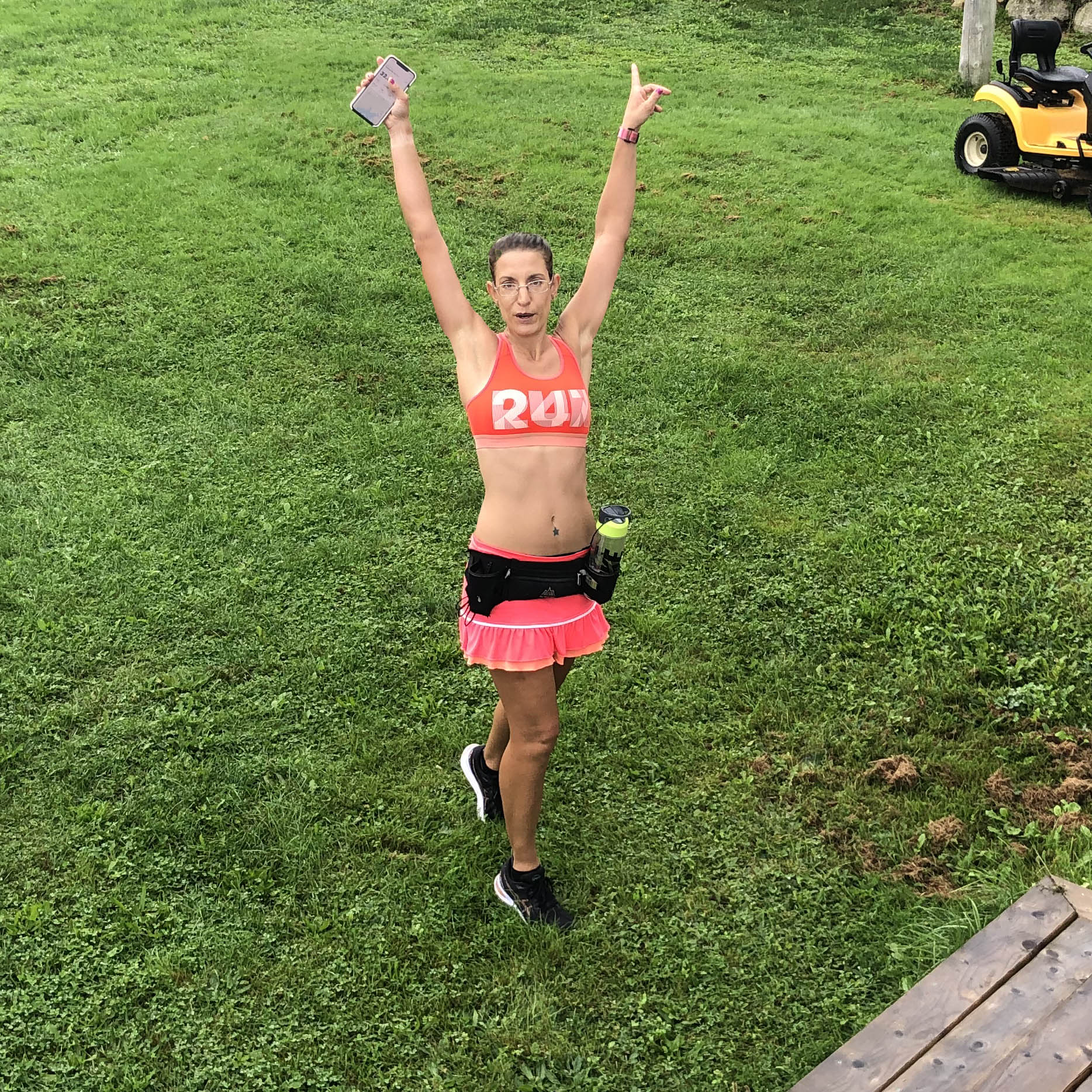 By the last 10k I was pretty tiered so even though it was overcast which is understandable. Usually when I’m running and especially long running honey doesn’t typically call or text. I’ll sometimes text him and let him know my progress at the 50% and 75% mark. But we do share our locations and sometimes he keeps an eye on me that way. So when I got the text 2km from home that it was raining there chances are it was a biblical sort of rain. Sure enough I looked up and there was a literal wall of rain about 4 houses down. Even though I paid extra for my watch, phone and earbuds to be waterproof I still ditched the rest of my rains and put all that in their ziplock bag. I was prepared to get very, very wet. I wasn’t prepared for 4 hours of salty sweat to pour into my eyes but since I was so close to home I just laughed it off and squinted a lot. Due to intense rain at the end there I didn’t get a cute picture of this one either instead enjoy this ‘gem’ that honey snapped of me on the way to the tub. Not my best angle!
