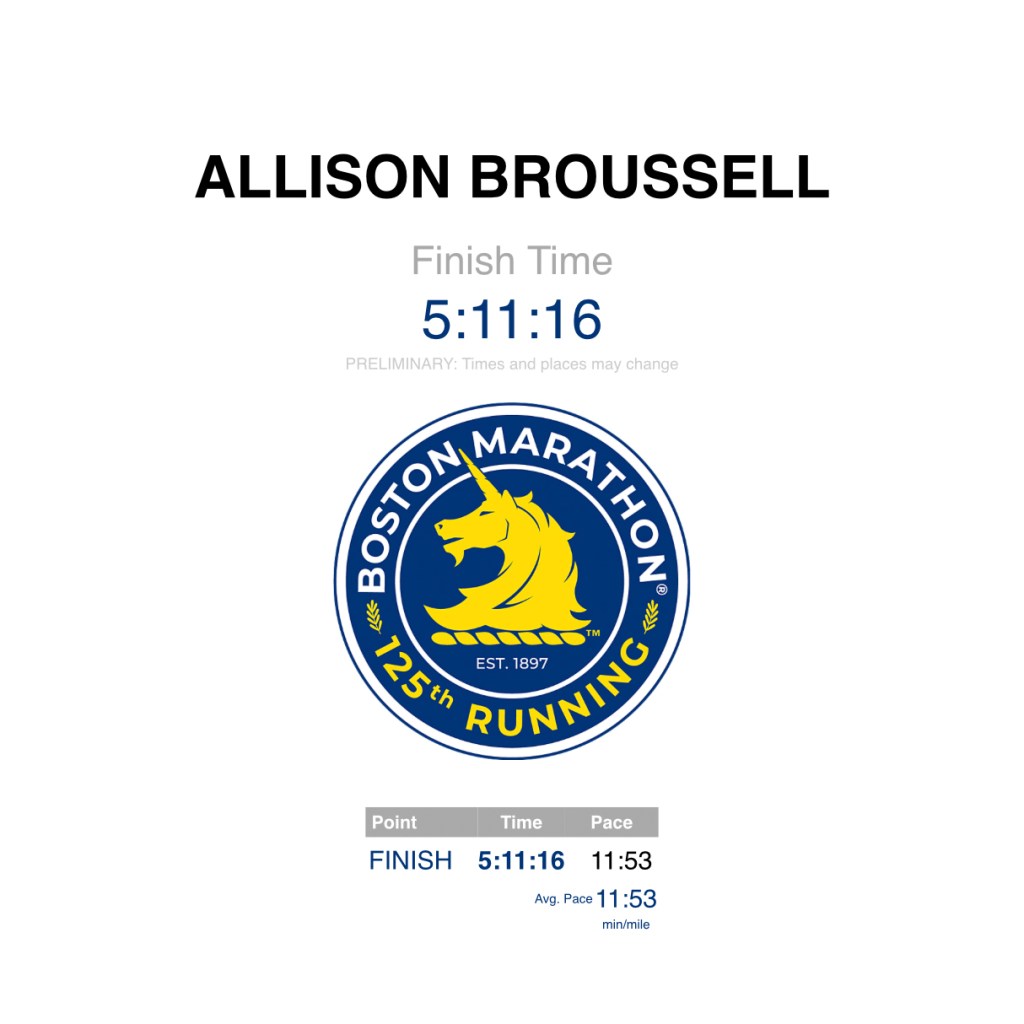 Results: Two notes on the results this time one housekeeping and one that’s a little self congratulatory. First if you want to look me up this time you’ll have to search for Allison Broussell because I was unable to register as Allison King, though it wasn’t for lack of trying. I suspect that another Allison king with my exact birthday had already done it. Next we don’t know exactly how many registered to do the Boston Virtual but it was a lot. The 70 000 celebration packages sold out fast but there was also a start line package that just included a medal. Let’s be conservative and say that at least 80 000 people signed up to do this. Well about 21 000 actually did. So I guess what I’m saying is 25% or fewer actually followed through so for anyone that actually followed through that’s pretty much an accomplishment in an of itself.